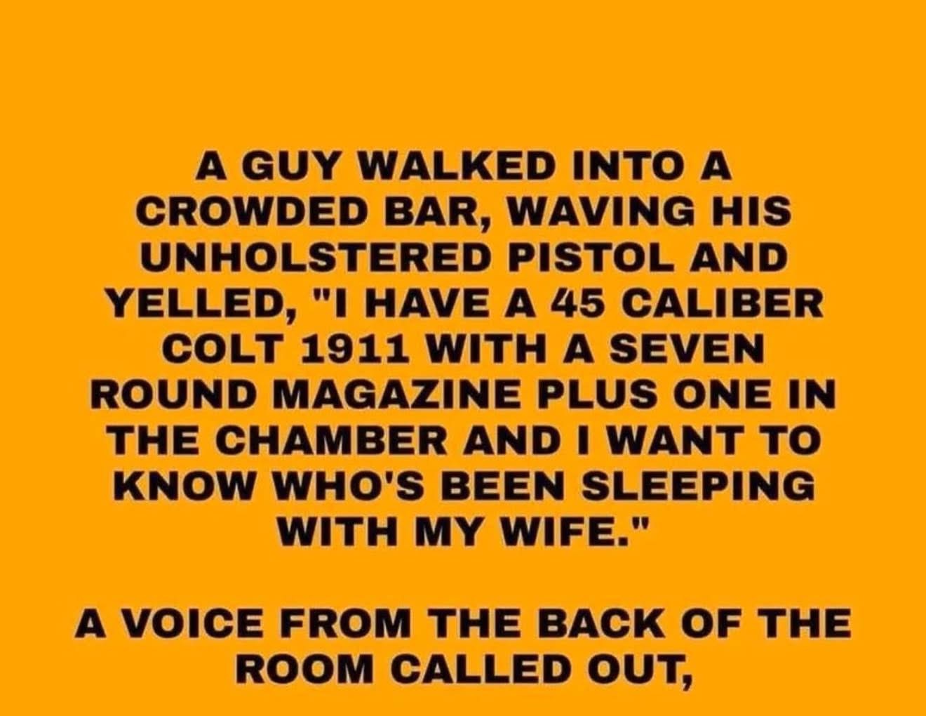 The Husband, The Gun, and The Epic Comeback I have a 45 caliber Colt 1911 with a seven round magazine plus one in the chamber and I want to know who’s been sleeping with my wife.” A voice from the back of the room called out, “You need more ammo!!!”