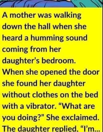 A mother was walking down the hall when she heard a humming sound coming from her daughter’s bedroom. When she opened the door she found her daughter without clothes on the bed with a vibrator. “What are you doing?”